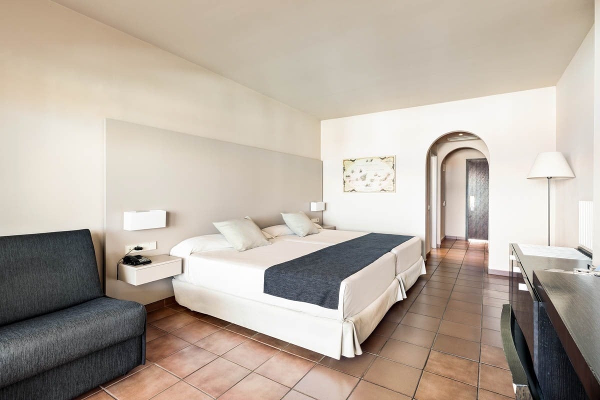 Habitaciones Vista Piscina con posibilidad para acoger hasta tres personas. Podrán estar equipadas con 1 cama de 1,80M o 2 camas de 1,10M + 1 sofá cama de 0,90M (no admiten supletorias).