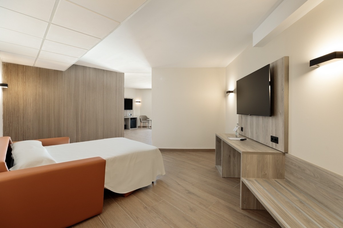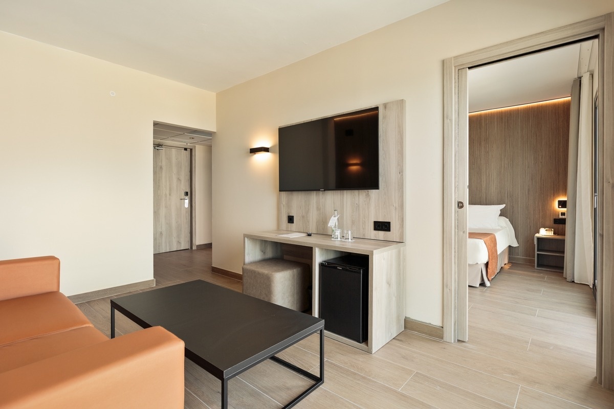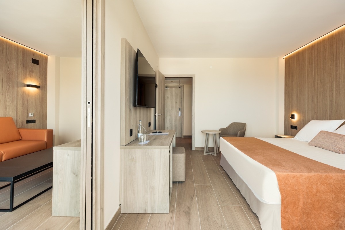 Las habitaciones Junior Suite están distribuidas en 1 habitación con 1 cama king size + 1 salón con sofá cama doble y 2 televisiones.