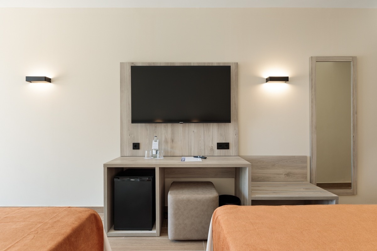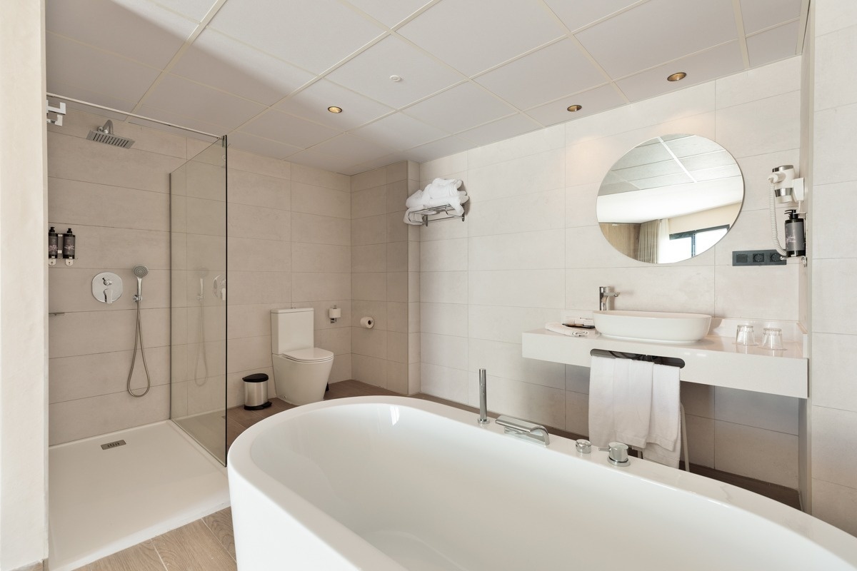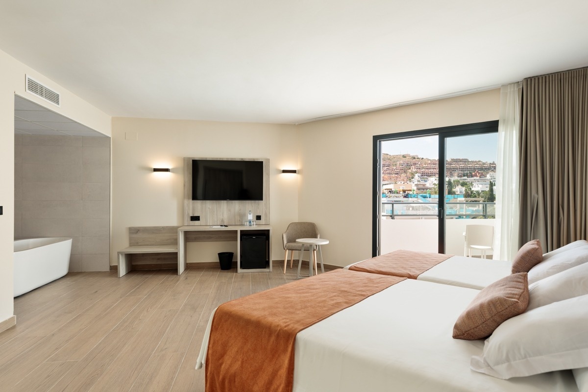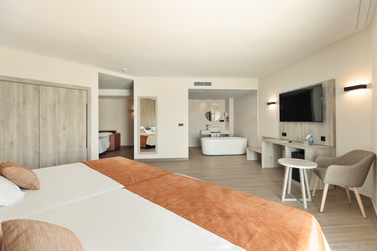 Las habitaciones Junior Suite están distribuidas en 1 habitación con 1 cama king size + 1 salón con sofá cama doble y 2 televisiones.