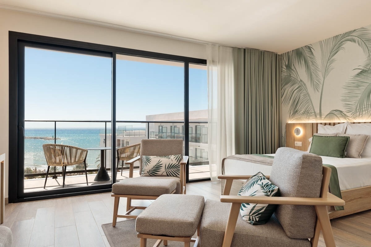 Habitaciones Junior Suite con vista Mar Frontal y con posibilidad para acoger hasta cuatro personas. Podrán estar equipadas con dos camas dobles (no admiten supletorias).